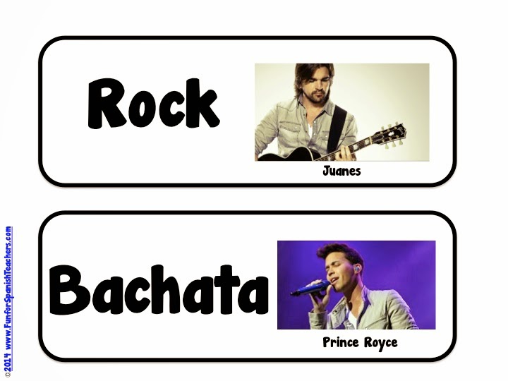 I have put together a list of songs that go along with the pictures. This might help your students identify the rhythms with the singers. This is also a fun way to bring some culture (and pop culture) into your classes. Feel free to add more traditional rhythms to your list. 隆A cantar y bailar!
