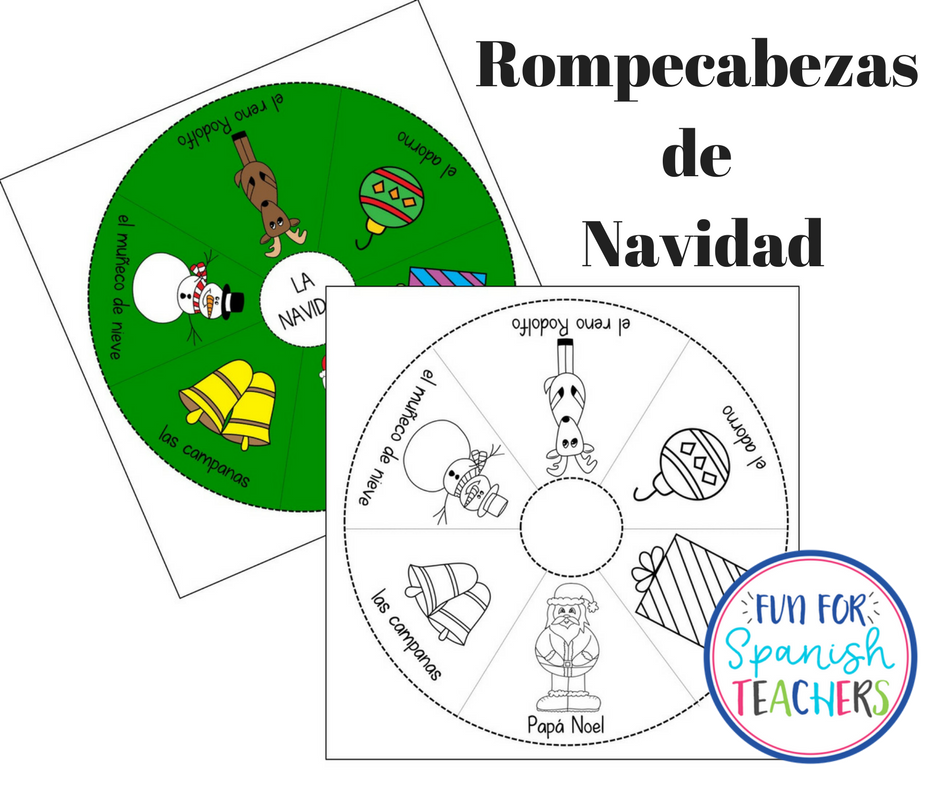 During these last weeks of December before winter break, I’m sharing some activities and ideas for you to use in your classes. This first activity is a simple puzzle with basic Christmas vocabulary. It is a great way to review colors. After coloring and cutting out the pieces, you can describe one of the pictures of the puzzle and ask your students to find it. If using the black and white version you could say “dice “¡Jo, jo, jo!”, ask a volunteer to tell you the name and describe the colors she used to color it. You can also set up a timer and organize a competition around putting the puzzle together. Whoever wins the competition will have to name all the vocabulary in the puzzle. This is a simple activity that works great with grades K-1. There is no right or wrong way to put it together.